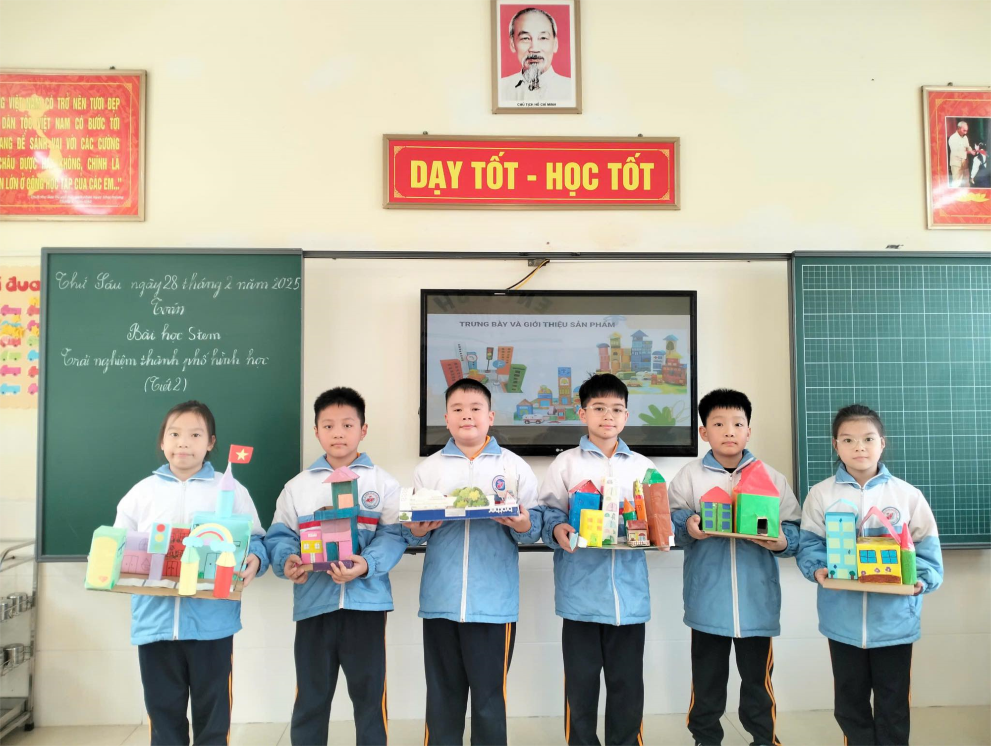 khối hộp chữ nhật, khối lập phương, khối trụ, khối cầu... các em học sinh đã cùng nhau xây dựng một "Thành phố tương lai" với các công trình kiến trúc như: nhà ở, trường học, bệnh viện, đường phố,...