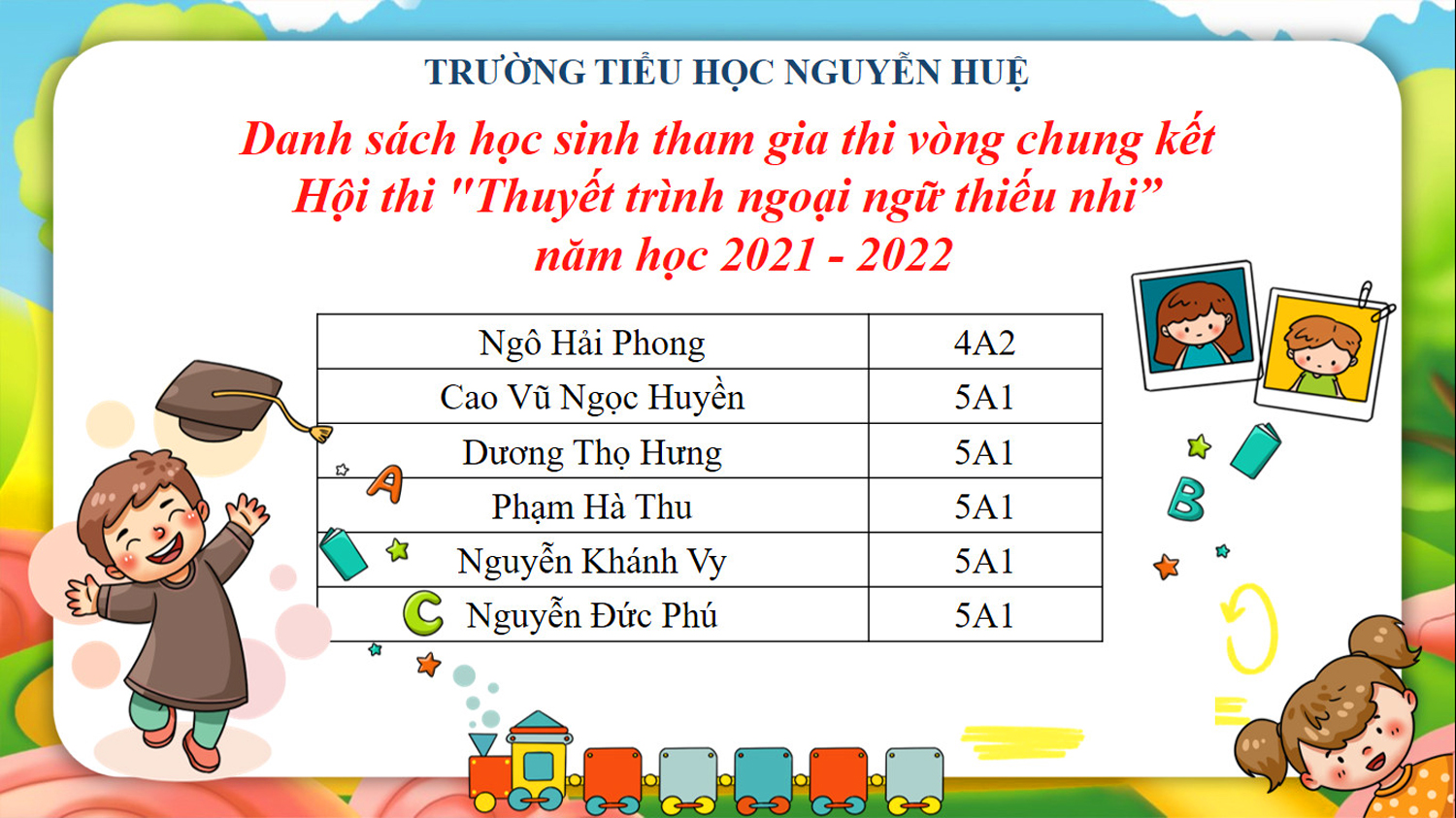 Xin chúc mừng các em học sinh của trường TH Nguyễn Huệ có tên trong danh sách dưới đây đã xuất sắc vượt qua vòng loại cấp tiểu học, tiếp tục tham gia vòng Chung kết của hội thi.