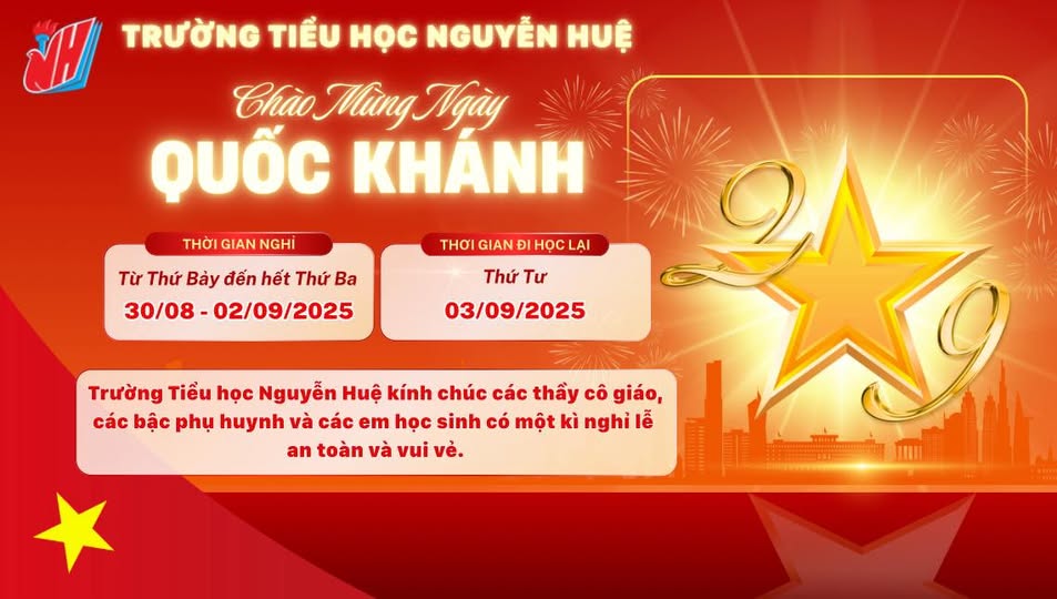 Hòa trong không khí tưng bừng của cả nước hướng về kỷ niệm 80 năm Ngày Cách mạng Tháng Tám và Quốc khánh 2/9 (2/9/1945 – 2/9/2025), Trường Tiểu học Nguyễn Huệ xin gửi tới các thầy cô giáo, quý phụ huynh và các em học sinh thông báo nghỉ lễ Quốc Khánh 2/9
