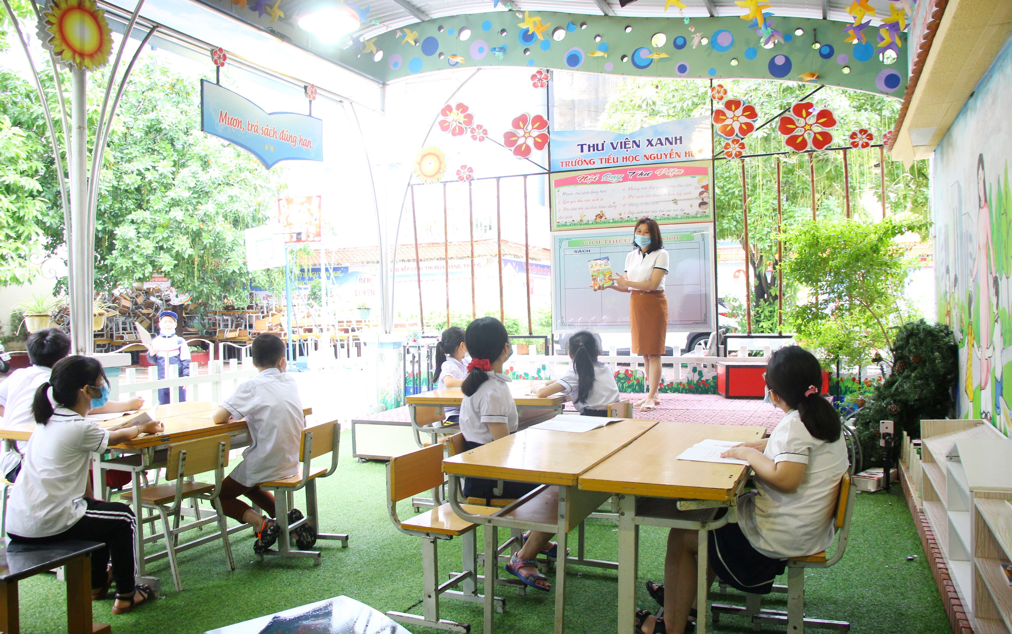 Nhưng cuộc sống ngày nay luôn rộng mở, cả về không gian cũng như sự phá cách trước khuôn mẫu truyền thống. “THƯ VIỆN XANH”, trường Tiểu học Nguyễn Huệ. Ngoài việc mỗi lớp học có một tủ sách dùng chung, nhà trường còn xây dựng thêm một thư viện sáng tạo có tính ứng dụng cao, trở thành điểm đến yêu thích của học sinh trong mỗi tiết đọc sách tại thư viện ngoài trời.